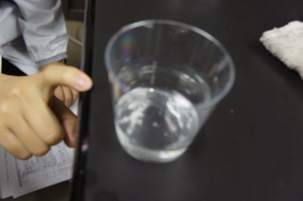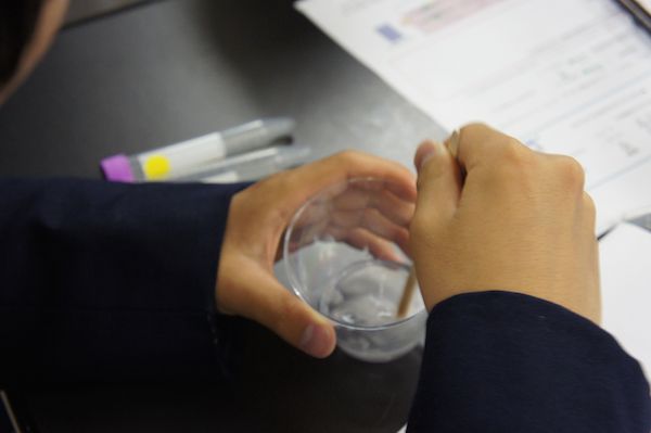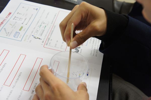 まずは「自分の口の中から細胞をとってDNAを抽出する実験」を行いました。
