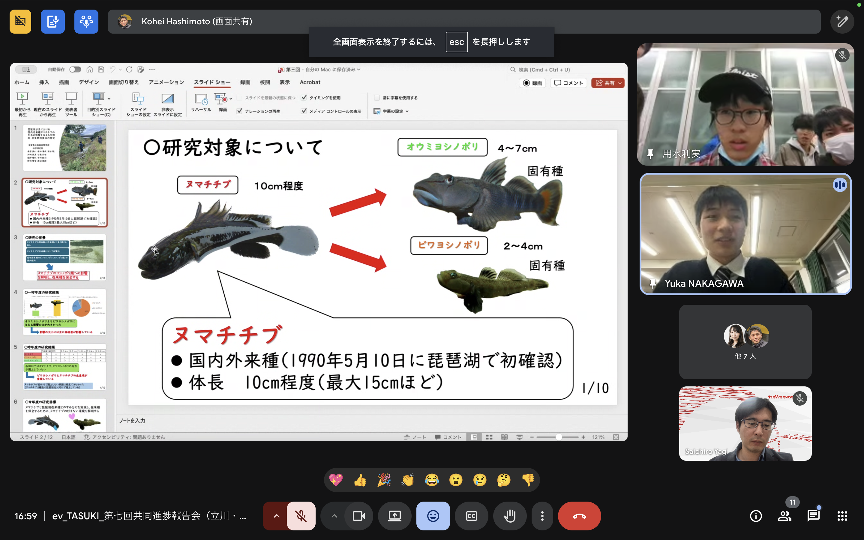 在来のヨシノボリと国内外来のトウヨシノボリの生息状況を複数河川で比較してきました。今回は個体数・標準体長・外部形態を系統ごとに記録し、河川ごとの分布差と交雑個体の存在を明らかにしたことを共有しました。今後は環境DNA分析も取り入れ、交雑個体がどのような環境へ適応しているかを調べていきます! |