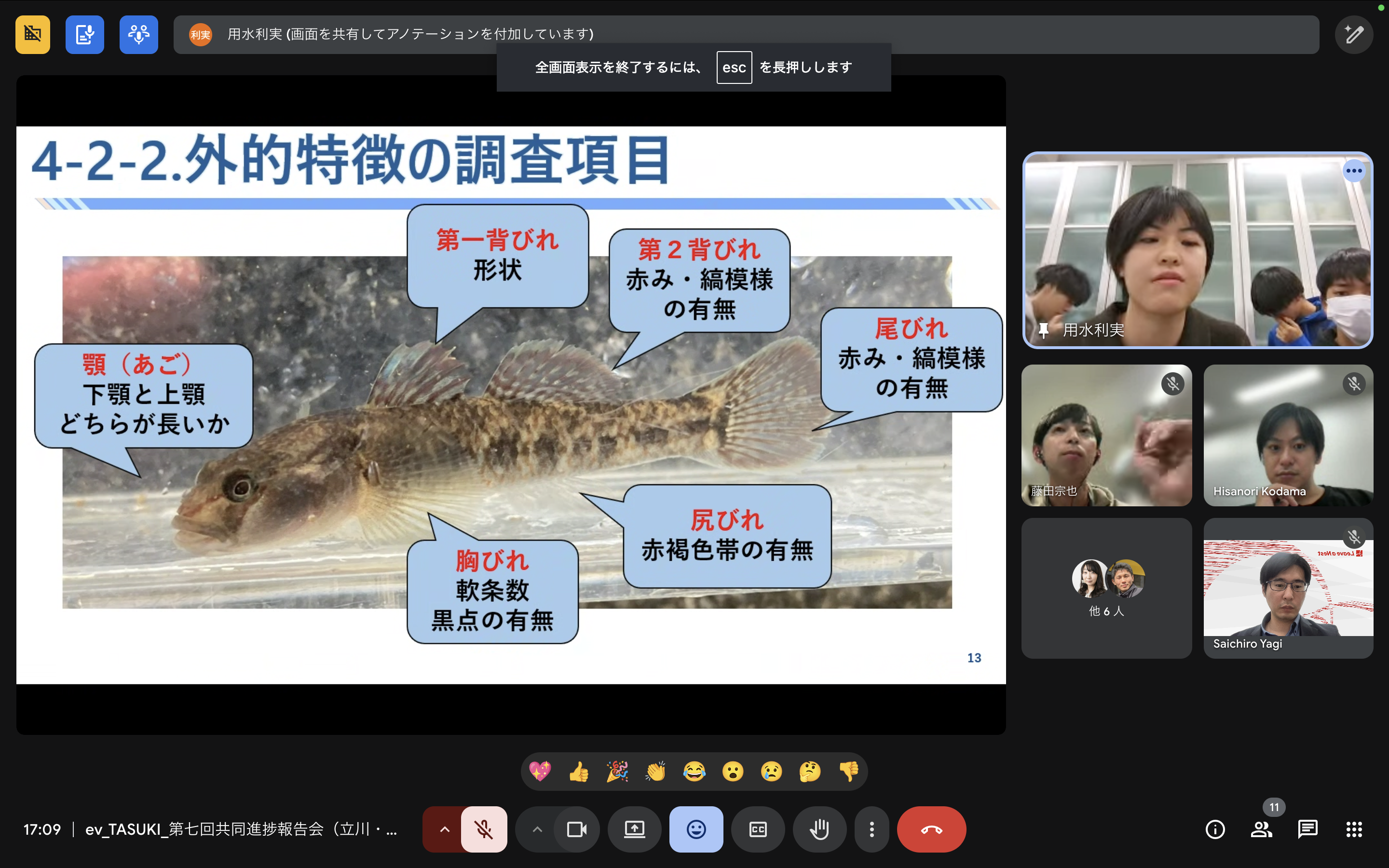 今回は、各校からの研究発表の後、生徒間はもちろんリバネスメンバーやフィッシュパスの藤田さんによるフィードバックとディスカッションの他、ヨシノボリの見分け方の議論といった話でも盛り上がりました!また、データの扱い方や考え方についても共有されました。