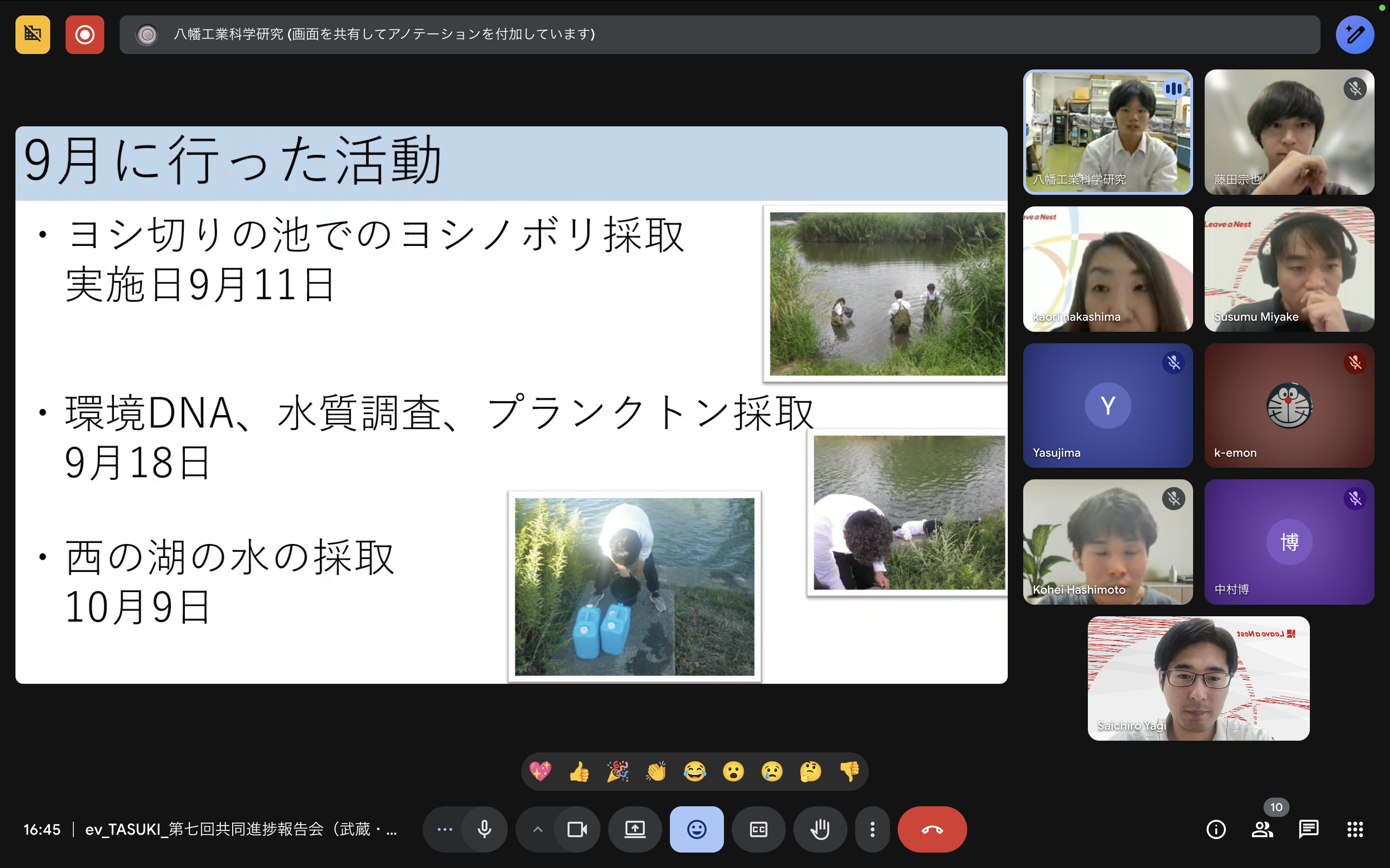 次世代とともに水圏の生物多様性評価に挑戦するTASUKIプロジェクトにおいて、2025年10月17日と10月30日の2回に分けて第七回共同進捗報告会を実施しました。初回が八幡工業と武蔵高校、続いて高島高等学校と立川高等学校の2校ずつでの進捗報告会となり、各校から研究活動の結果と考察が発表されました。さらに、今年12月に開催予定のScience Castle World 2025の特別企画に向けた内容の検討も行いました。