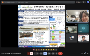 多摩川中流域において、異なる環境条件が魚類相にどのような影響を及ぼすのかを研究してきました。昨年度に実施した温排水の影響調査を発展させ、南多摩排水センター付近に加えて残堀川を比較対象として調査を行いました。現在は、通年で取得したデータをもとに、水温・水質と魚類分布の関係を解析しています。 今回のサイエンスキャッスルでの発表を通じて、環境DNA以外のデータ活用方法について意見を受け、研究を深めるきっかけとなりました。今後は、環境DNAの結果比較や文献調査を進め、水温や環境変化が分布に与える影響要因の特定を目指します。 |
