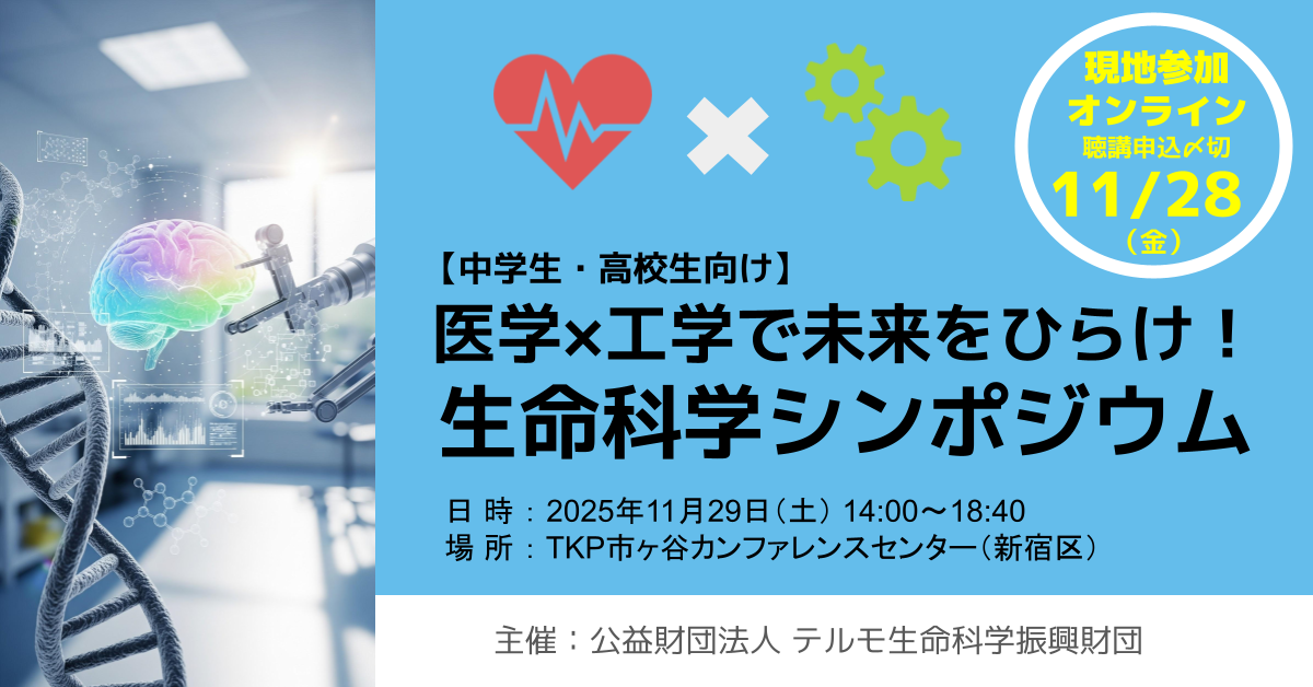 公益財団法人テルモ生命科学振興財団は、2025年11月29日(土)に中学生、高校生を対象に「医学×工学で未来をひらけ!生命科学シンポジウム」をTKP市ヶ谷カンファレンスセンター(新宿区)にて開催します。本シンポジウムでは、医学・工学・生命科学の連携で発展する現代医療について、最前線の研究者の講演を通じて学び、進路や社会とのかかわり方を考えるきっかけを提供します。また、同分野の若手研究者たちとのポスター交流会やリバネスが企画・実施する体験型教室も実施予定です。医療への多様な接点を体感できる機会となっているので、医療や工学の分野に関心のある中学生・高校生の皆さまはぜひご参加ください。
